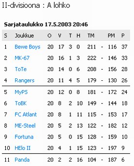 | 17 | 15.3.2003 | Hyvinkää1 | Rangers | - | Bewe Boys | 9 | - | 10 | Raportti | ||