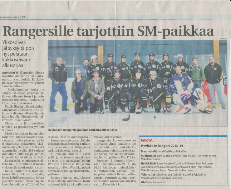 Rangerssille tarjottiin SM-paikkaa-Lehtijuttu